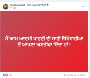 ਜਲੰਧਰ ਪੱਛਮੀ ਤੋਂ ‘ਆਪ’ ਵਿਧਾਇਕ ਸ਼ੀਤਲ ਅੰਗੁਰਾਲ ਨੇ ਦਿੱਤਾ ਅਸਤੀਫ਼ਾ