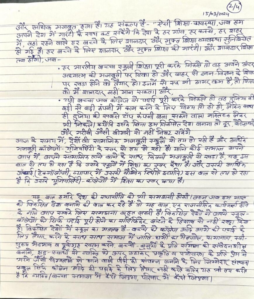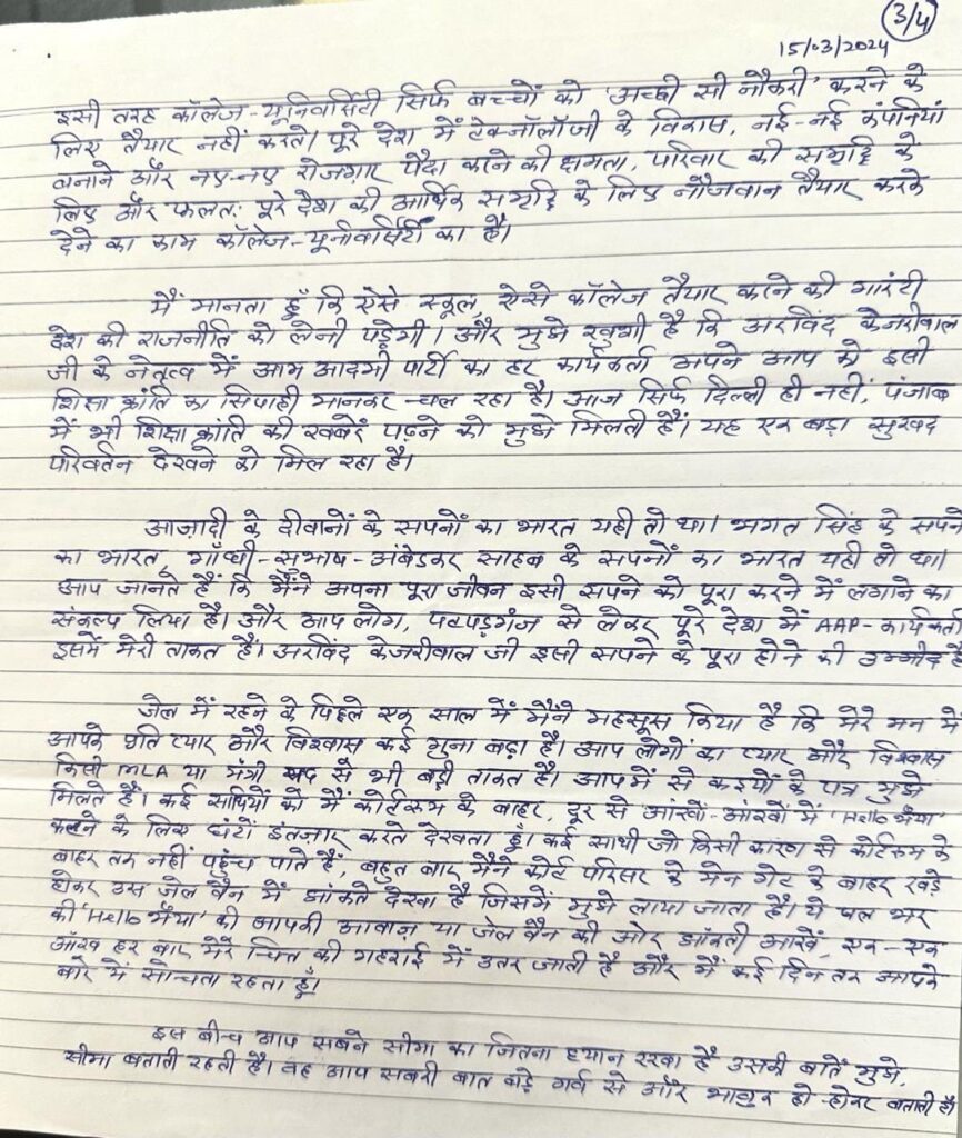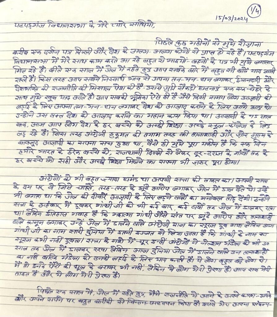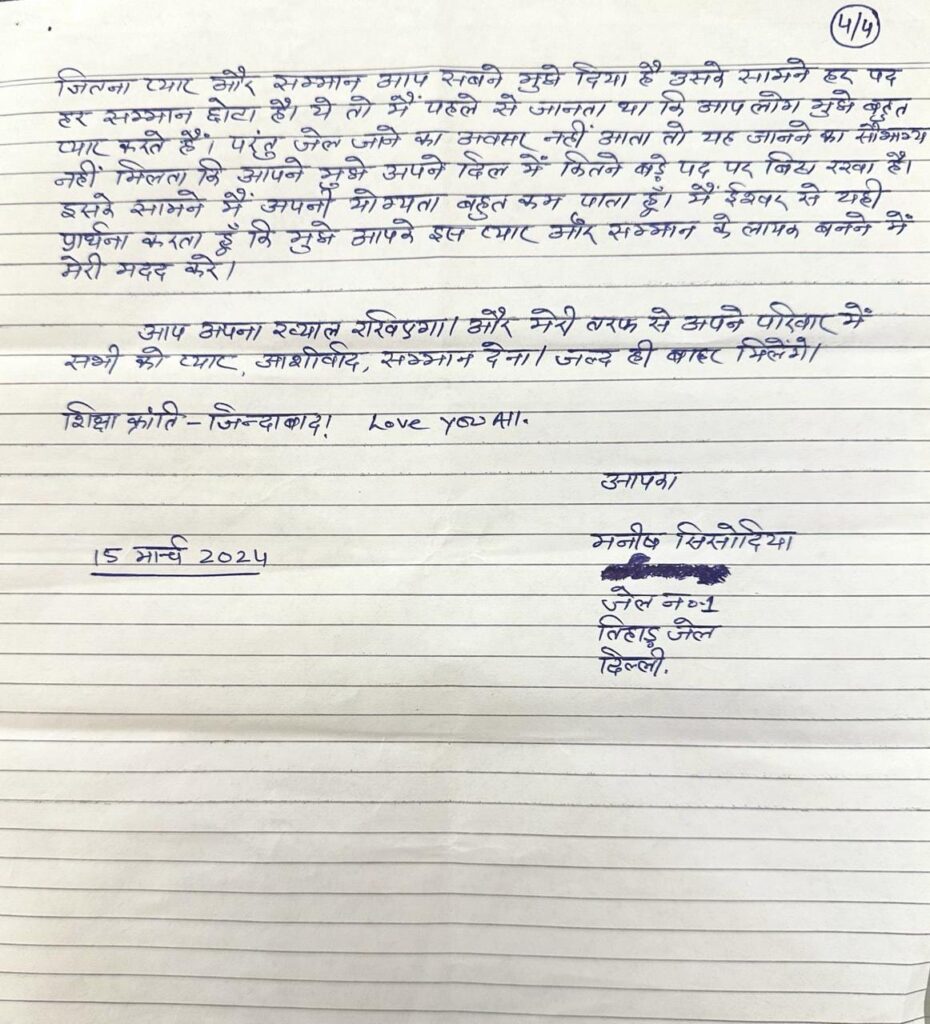 ਨਵੀਂ ਦਿੱਲੀ: ਦਿੱਲੀ ਸ਼ਰਾਬ ਘੋਟਾਲੇ ਮਾਮਲੇ ਵਿਚ ਜੇਲ੍ਹ ‘ਚ ਬੰਦ ਦਿੱਲੀ ਦੇ ਸਾਬਕਾ ਮੁੱਖ ਮੰਤਰੀ ਮਨੀਸ਼ ਸਿਸੋਦੀਆ ਨੇ ਇਕ ਚਿੱਠੀ ਲਿਖੀ ਹੈ, ਜਿਸ ਵਿਚ ਉਨ੍ਹਾਂ ਵੱਲੋਂ ਕੁਝ ਭਾਵੂਕ ਸੰਦੇਸ਼ ਲਿਖਿਆ ਗਿਆ ਹੈ। ਉਨ੍ਹਾਂ ਚਿੱਠੀ ਵਿਚ ਲਿਖਿਆ ਕਿ ਮੈਂ ਪਿਛਲੇ ਇਕ ਸਾਲ ਵਿਚ ਸਾਰੀਆਂ ਨੂੰ ਬਹੁਤ ਯਾਦ ਕੀਤਾ। ਅਸੀਂ ਸਾਰਿਆਂ ਨੇ ਮਿਲ ਕੇ ਬੜੀ ਇਮਾਨਦਾਰੀ ਨਾਲ ਕੰਮ ਕੀਤਾ। ਜਿਸ ਤਰ੍ਹਾਂ ਆਜ਼ਾਦੀ ਦੇ ਸਮੇਂ ਹਰ ਕੋਈ ਲੜਿਆ ਸੀ, ਉਸੇ ਤਰ੍ਹਾਂ ਅਸੀਂ ਚੰਗੀ ਸਿੱਖਿਆ ਅਤੇ ਸਕੂਲਾਂ ਲਈ ਲੜ ਰਹੇ ਹਾਂ। ਇਸ ਤੋਂ ਇਲਾਵਾ ਉਨ੍ਹਾਂ ਵੱਲੋਂ ਇਸ ਚਿੱਠੀ ਵਿਚ ਕੇਂਦਰ ਸਰਕਾਰ ਨੂੰ ਆੜੇ ਹੱਥੀ ਲੈਂਦੇ ਹੋਏ ਤਿੱਖੇ ਨਿਸ਼ਾਨੇ ਸਾਧੇ ਗਏ ਹਨ।