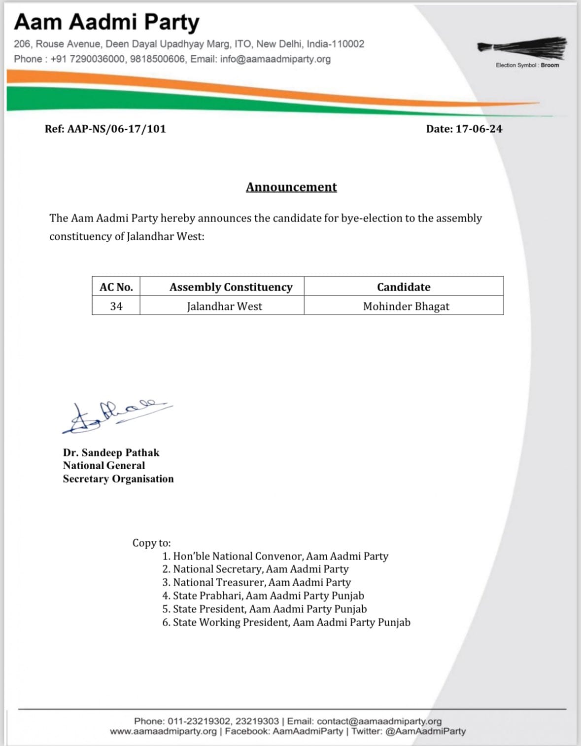 ਚੰਡੀਗੜ੍ਹ : ਆਮ ਆਦਮੀ ਪਾਰਟੀ ਨੇ ਪੰਜਾਬ ਦੀ ਜਲੰਧਰ ਜ਼ਿਮਨੀ ਚੋਣ ਲਈ ਆਪਣੇ ਉਮੀਦਵਾਰ ਦਾ ਐਲਾਨ ਕਰ ਦਿੱਤਾ ਹੈ। ਇਸ ਵਾਰ ‘ਆਪ’ ਨੇ ਭਾਜਪਾ ਛੱਡ ਕੇ ਆਮ ਆਦਮੀ ਪਾਰਟੀ ‘ਚ ਸ਼ਾਮਲ ਹੋਏ ਮੋਹਿੰਦਰ ਭਗਤ ‘ਤੇ ਭਰੋਸਾ ਪ੍ਰਗਟਾਇਆ ਹੈ। ਆਪ ਨੇ ਮੋਹਿੰਦਰ ਭਗਤ ਨੂੰ ਉਮੀਦਵਾਰ ਐਲਿਆ ਹੈ ਜੋ ਕਿ 14 ਅ੍ਰਪੈਲ ਨੂੰ ਭਾਜਪਾ ਛੱਡ ਕੇ ਆਏ ਸਨ ਤੇ ਉਹਨਾਂ ਨੇ ਆਪ ਦਾ ਪੱਲਾ ਫੜ ਲਿਆ ਸੀ। ਮੋਹਿੰਦਰ ਭਗਤ ਦਾ ਪੱਛਮੀ ਹਲਕੇ ਵਿਚ ਕਾਫ਼ੀ ਪ੍ਰਭਾਵ ਹੈ।