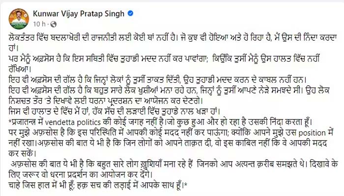 ਪਰ ਮੈਨੂੰ ਅਫ਼ਸੋਸ ਹੈ ਕਿ ਇਸ ਸਥਿਤੀ ਵਿੱਚ ਤੁਹਾਡੀ ਮਦਦ ਨਹੀਂ ਕਰ ਪਾਵਾਂਗਾ; ਕਿਉਂਕਿ ਤੁਸੀਂ ਮੈਨੂੰ ਉਸ ਹਾਲਤ ਵਿੱਚ ਨਹੀਂ ਰੱਖਿਆ। ਇਹ ਵੀ ਅਫ਼ਸੋਸ ਦੀ ਗੱਲ ਹੈ ਕਿ ਜਿਨ੍ਹਾਂ ਲੋਕਾਂ ਨੂੰ ਤੁਸੀਂ ਤਾਕਤ ਦਿੱਤੀ, ਉਹ ਤੁਹਾਡੀ ਮਦਦ ਕਰਨ ਦੇ ਕਾਬਲ ਨਹੀਂ ਹਨ। ਇਹ ਵੀ ਅਫ਼ਸੋਸ ਦੀ ਗੱਲ ਹੈ ਕਿ ਬਹੁਤ ਸਾਰੇ ਲੋਕ ਖੁਸ਼ੀਆਂ ਮਨਾ ਰਹੇ ਹਨ, ਜਿਨ੍ਹਾਂ ਨੂੰ ਤੁਸੀਂ ਆਪਣੇ ਨੇੜੇ ਸਮਝਦੇ ਸੀ। ਉਹ ਲੋਕ ਨਿਸ਼ਚਤ ਤੌਰ ‘ਤੇ ਦਿਖਾਵੇ ਲਈ ਧਰਨਾ ਪ੍ਰਦਰਸ਼ਨ ਦਾ ਆਯੋਜਨ ਕਰ ਦੇਣਗੇ। ਜਿਸ ਵੀ ਹਾਲਾਤ ਦੇ ਵਿੱਚ ਮੈਂ ਹਾਂ, ਹੱਕ ਸੱਚ ਦੀ ਲੜਾਈ ਵਿੱਚ ਤੁਹਾਡੇ ਨਾਲ ਖੜ੍ਹਾ ਹਾਂ।” ਤੁਹਾਨੂੰ ਦੱਸ ਦਈਏ ਕਿ ਵਿਧਾਇਕ ਕੁਵੰਰ ਵਿਜੈ ਪ੍ਰਤਾਪ ਸਿੰਘ ਵਿਧਾਨ ਸਭਾ 2022 ਵਿਚ ਆਮ ਆਦਮੀ ਪਾਰਟੀ ਵੱਲੋਂ ਕੋਟਕਪੂਰਾਂ ਤੋਂ ਚੋਣ ਲੜੀ ਸੀ। ‘ਆਪ’ਪਾਰਟੀ ਦੇ ਹੁਣ ਤੱਕ ਦੇ 2 ਸਾਲ ਦੇ ਕਾਰਜਕਾਲ ਤੋਂ ਉਹ ਉਦਾਸ ਨਜ਼ਰ ਆਏ ਹਨ। ਉਨ੍ਹਾਂ ਵੱਲੋਂ ਲਗਾਤਾਰ ਸਰਕਾਰ ਖਿਲਾਫ ਬਿਆਨਬਾਜ਼ੀ ਵੀ ਕੀਤੀ ਜਾਂਦੀ ਹੈ।