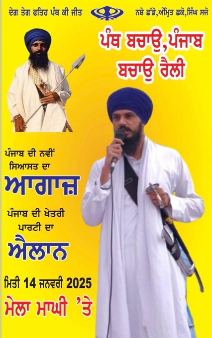NSA ਤਹਿਤ ਅਸਾਮ ਦੀ ਡਿੱਬਰੂਗੜ੍ਹ ਜੇਲ੍ਹਾਂ ਵਿਚ ਬੰਦ ਖਡੂਰ ਸਾਹਿਬ ਤੋਂ ਸੰਸਦ ਮੈਂਬਰ ਅੰਮ੍ਰਿਤਪਾਲ ਸਿੰਘ ਹੁਣ ਨਵੀਂ ਖੇਤਰੀ ਪਾਰਟੀ ਦਾ ਐਲਾਨ ਜਲਦ ਕਰ ਸਕਦੇ ਹਨ। ਤਾਜ਼ਾਂ ਜਾਣਕਾਰੀ ਮੁਤਾਬਕ ਸੰਸਦ ਮੈਂਬਰ ਅੰਮ੍ਰਿਤਪਾਲ ਸਿੰਘ 14 ਜਨਵਰੀ ਨੂੰ ਪੰਜਾਬ ਦੀ ਨਵੀਂ ਖੇਤਰੀ ਸਿਆਸੀ ਪਾਰਟੀ ਦੀ ਸ਼ੁਰੂਆਤ ਕਰਨਗੇ। ਪਾਰਟੀ ਦਾ ਐਲਾਨ ਸ੍ਰੀ ਮੁਕਤਸਰ ਸਾਹਿਬ ਵਿਖੇ ਹੋਣ ਵਾਲੇ ਮਾਘੀ ਮੇਲੇ “ਮੇਲਾ ਮਾਘੀ ਦਾ” ‘ਤੇ ਹੋਵੇਗਾ।