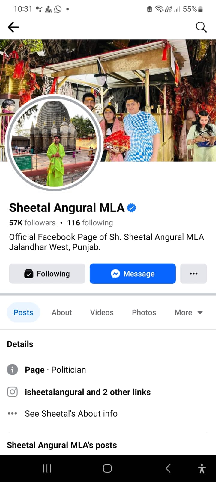 ਹੁਣ ਉਸ ਪ੍ਰੋਫਾਈਲ ਫੋਟੋ ‘ਤੇ ਉਨ੍ਹਾਂ ਵੱਲੋਂ ਆਪਣੇ ਪਰਿਵਾਰ ਦੀ ਫੋਟੋ ਲਗਾਈ ਗਈ ਹੈ। ਸ਼ੀਤਲ ਅੰਗੁਰਾਲ ਨੇ ਇਕ ਨਿੱਜੀ ਚੈਨਲ ਨਾਲ ਗੱਲਬਾਤ ਦੌਰਾਨ ਕਿਹਾ ਕਿ ਉਹ ਫਿਲਹਾਲ ਕਿਸੇ ਵੀ ਪਾਰਟੀ ‘ਚ ਸ਼ਾਮਲ ਨਹੀਂ ਹੋਣਗੇ। ਉਹ ਫਿਲਹਾਲ ਬੱਸ MLA ਬਣ ਕੇ ਲੋਕਾਂ ਦੀ ਸੇਵਾ ਕਰਨਗੇ। ਦੱਸ ਦਈਏ ਕਿ ਸ਼ੀਤਲ ਅੰਗੁਰਤਲ 27 ਮਾਰਚ ਨੂੰ ਜਲੰਧਰ ਤੋਂ MP ਸ਼ੁਸ਼ੀਲ ਕੁਮਾਰ ਰਿੰਕੂ ਨਾਲ ਬੀਜੇਪੀ ‘ਚ ਸ਼ਾਮਲ ਹੋਏ ਸੀ। ਉਨ੍ਹਾਂ ਨੇ 2022 ਵਿਚ ਆਮ ਆਦਮੀ ਪਾਰਟੀ ਵੱਲੋਂ ਵਿਧਾਨ ਸਭਾ ਚੋਣਾ ਲੜੀਆਂ ਸਨ।