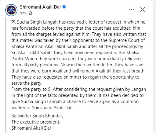 ਚੰਡੀਗੜ੍ਹ, 3 ਅਕਤੂਬਰ, 2024: ਸੁੱਚਾ ਸਿੰਘ ਲੰਗਾਹ ਦੀ ਅਕਾਲੀ ਦਲ ‘ਚ ਵਾਪਸੀ ਹੋ ਗਈ ਹੈ। ਇਸ ਸੰਬੰਧੀ ਅਕਾਲੀ ਦਲ ਵੱਲੋਂ ਆਪਣੇ ਸੋਸ਼ਲ ਮੀਡੀਆ ਅਕਾਊਂਟ ਐਕਸ ‘ਤੇ ਇੱਕ ਪੋਸਟ ਪਾਈ ਗਈ ਹੈ। ਇਸ ਪੋਸਟ ‘ਚ ਅਕਾਲੀ ਦਲ ਨੇ ਕਿਹਾ ਹੈ ਕਿ, “ਸੁੱਚਾ ਸਿੰਘ ਲੰਗਾਹ ਵੱਲੋਂ ਬੇਨਤੀ ਦੇ ਰੂਪ ਵਿੱਚ ਇੱਕ ਪੱਤਰ ਮਿਲਿਆ ਹੈ ਜਿਸ ਵਿੱਚ ਉਹਨਾਂ ਇਹ ਗੱਲ ਪਾਰਟੀ ਅੱਗੇ ਰੱਖੀ ਹੈ ਕਿ ਉਹਨਾਂ ਉੱਤੇ ਲਾਏ ਗਏ ਸਾਰੇ ਇਲਜ਼ਾਮਾਂ ਤੋਂ ਅਦਾਲਤ ਨੇ ਉਹਨਾਂ ਨੂੰ ਦੋਸ਼ ਮੁਕਤ (ਬਰੀ) ਕਰਾਰ ਦਿੱਤਾ ਹੈ। ਉਹਨਾਂ ਇਹ ਵੀ ਲਿਖਿਆ ਹੈ ਕਿ ਉਨ੍ਹਾਂ ਦੇ ਵਿਰੋਧੀਆਂ ਵੱਲੋਂ ਇਹ ਮਾਮਲਾ ਖ਼ਾਲਸਾ ਪੰਥ ਦੀ ਸਰਵਉੱਚ ਅਦਾਲਤ ਸ੍ਰੀ ਅਕਾਲ ਤਖ਼ਤ ਸਾਹਿਬ ‘ਤੇ ਵੀ ਲਿਜਾਇਆ ਗਿਆ ਸੀ ਅਤੇ ਸ੍ਰੀ ਅਕਾਲ ਤਖ਼ਤ ਸਾਹਿਬ ਵੱਲੋਂ ਸਾਰੀ ਕਾਰਵਾਈ ਉਪਰੰਤ ਹੁਣ ਉਹਨਾਂ ਨੂੰ ਮੁੜ ਖ਼ਾਲਸਾ ਪੰਥ ਵਿੱਚ ਸ਼ਾਮਿਲ ਕੀਤਾ ਜਾ ਚੁੱਕਾ ਹੈ।