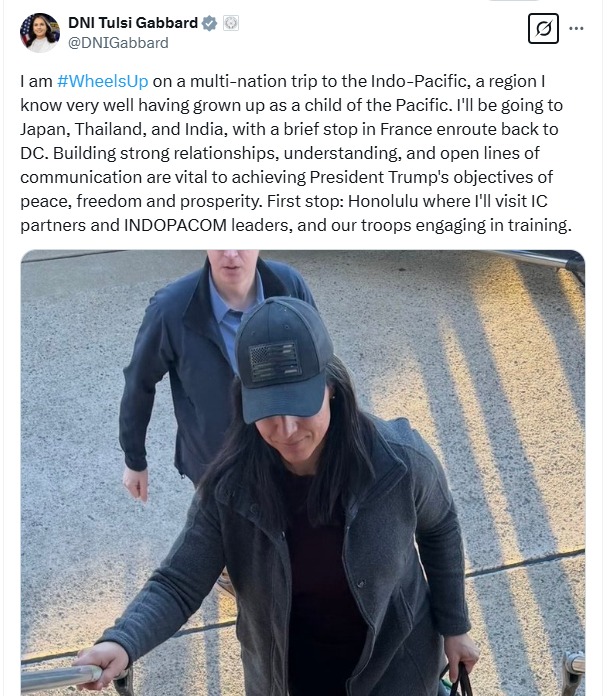 ਅਮਰੀਕੀ ਨੈਸ਼ਨਲ ਇੰਟੈਲੀਜੈਂਸ ਡਾਇਰੈਕਟਰ ਤੁਲਸੀ ਗੈਬਾਰਡ (Tulsi Gabbard) ਮੰਗਲਵਾਰ ਨੂੰ ਭਾਰਤ ਸਮੇਤ ਹਿੰਦ-ਪ੍ਰਸ਼ਾਂਤ ਮਹਾਂਸਾਗਰ ਦੀ ਬਹੁ-ਰਾਸ਼ਟਰੀ ਯਾਤਰਾ ‘ਤੇ ਰਵਾਨਾ ਹੋਈ । ਆਪਣੇ ਆਪ ਨੂੰ ‘child of the Pacific’ ਦੱਸਦਿਆਂ, ਗੈਬਾਰਡ ਨੇ ਕਿਹਾ ਕਿ ਉਹ ਫਰਾਂਸ ਵਿੱਚ ਇੱਕ ਸੰਖੇਪ ਰੁਕਣ ਦੇ ਨਾਲ ਜਾਪਾਨ, ਥਾਈਲੈਂਡ ਅਤੇ ਭਾਰਤ ਜਾਵੇਗੀ । ਉਨ੍ਹਾਂ ਵੱਲੋਂ ਸ਼ੋਸ਼ਮ ਮੀਡੀਆਂ ਐਕਸ ‘ਤੇ ਲਿਖਿਆ ਗਿਆ ਕਿ “ਮੈਂ ਹਿੰਦ-ਪ੍ਰਸ਼ਾਂਤ ਮਹਾਂਸਾਗਰ ਦੀ ਇੱਕ ਬਹੁ-ਰਾਸ਼ਟਰੀ ਯਾਤਰਾ ‘ਤੇ ਚੱਲ ਰਹੀ ਹਾਂ, ਇੱਕ ਅਜਿਹਾ ਖੇਤਰ ਜਿਸਨੂੰ ਮੈਂ ਚੰਗੀ ਤਰ੍ਹਾਂ ਜਾਣਦੀ ਹਾਂ ਕਿਉਂਕਿ ਮੈਂ ਪ੍ਰਸ਼ਾਂਤ ਮਹਾਂਸਾਗਰ ਦੇ ਬੱਚੇ ਵਜੋਂ ਵੱਡੀ ਹੋਈ ਹਾਂ। ਮੈਂ ਜਾਪਾਨ, ਥਾਈਲੈਂਡ ਅਤੇ ਭਾਰਤ ਜਾਵਾਂਗੀ , ਡੀਸੀ ਵਾਪਸ ਜਾਂਦੇ ਸਮੇਂ ਫਰਾਂਸ ਵਿੱਚ ਇੱਕ ਸੰਖੇਪ ਲਈ ਰੁੱਕਾਂਗੀ। ਉਨ੍ਹਾਂ ਅੱਗੇ ਕਿਹਾ ਕੀ ਰਾਸ਼ਟਰਪਤੀ ਟਰੰਪ ਦੇ ਸ਼ਾਂਤੀ, ਆਜ਼ਾਦੀ ਅਤੇ ਖੁਸ਼ਹਾਲੀ ਦੇ ਉਦੇਸ਼ਾਂ ਨੂੰ ਪ੍ਰਾਪਤ ਕਰਨ ਲਈ ਮਜ਼ਬੂਤ ਸਬੰਧ, ਸਮਝ ਅਤੇ ਸੰਚਾਰ ਦੀਆਂ ਖੁੱਲ੍ਹੀਆਂ ਲਾਈਨਾਂ ਬਣਾਉਣਾ ਬਹੁਤ ਜ਼ਰੂਰੀ ਹੈ। ਉਨ੍ਹਾਂ ਦੱਸਿਆ ਕਿ ਉਨ੍ਹਾਂ ਦਾ ਪਹਿਲਾ ਪੜਾਅ ਹੋਨੋਲੂਲੂ ਹੈ ਜਿੱਥੇ ਉਹ ਆਈਸੀ ਭਾਈਵਾਲਾਂ ਅਤੇ ਇੰਡੋਪੈਕੌਮ ਨੇਤਾਵਾਂ, ਅਤੇ ਸਿਖਲਾਈ ਵਿੱਚ ਸ਼ਾਮਲ ਸਾਡੇ ਸੈਨਿਕਾਂ ਨੂੰ ਮਿਲਣ ਜਾਣਗੇ।”